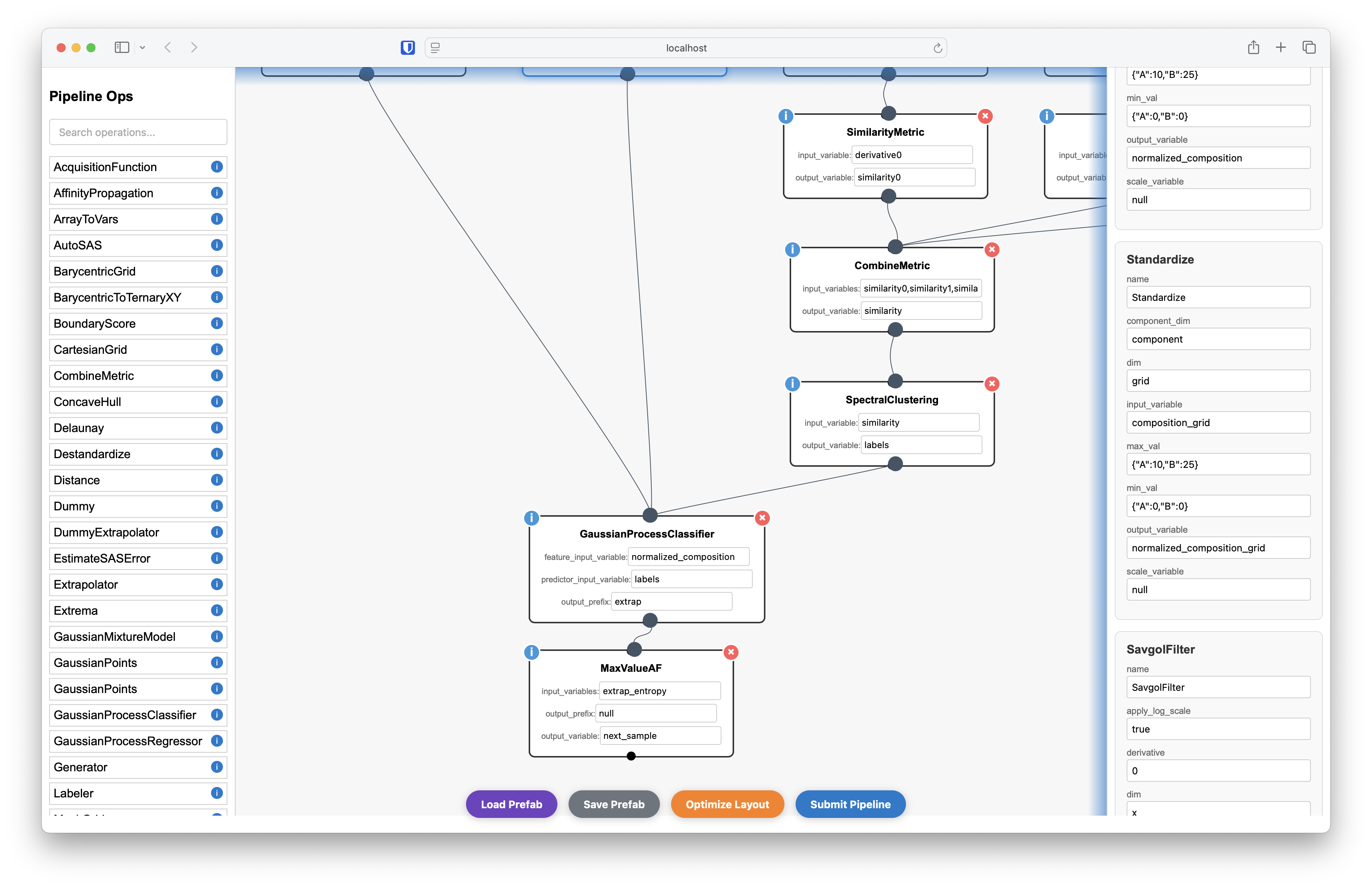 The Pipeline Builder is a web-based graphical user interface for creating, editing, and managing data processing pipelines in AFL. This interactive tool allows you to drag and drop pipeline operations, connect them visually, and configure their parameters through an intuitive interface.