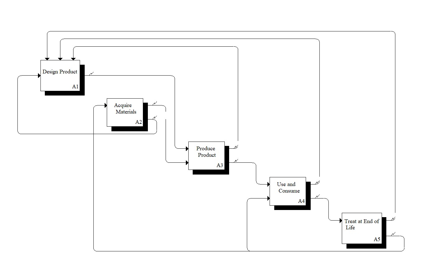 Reference Model: The Production in a Circular Economy (CE) Model consists of five life cycle activities (Design Product, Acquire Materials, Produce Product, Use and Consume, and Treat at End of Life) that are consistent with manufacturing economic models. Using the IDEF0 functional modeling method, each activity and its relevant inputs, outputs, controls, and mechanisms are defined. The model is defined for a generic product and may need to be adapted for specific industry sectors. Example use: identifying the organization's reference situation with regards to circular economy and mapping the system to identify where processes can be changed, as indicated by ISO 59004:2024.