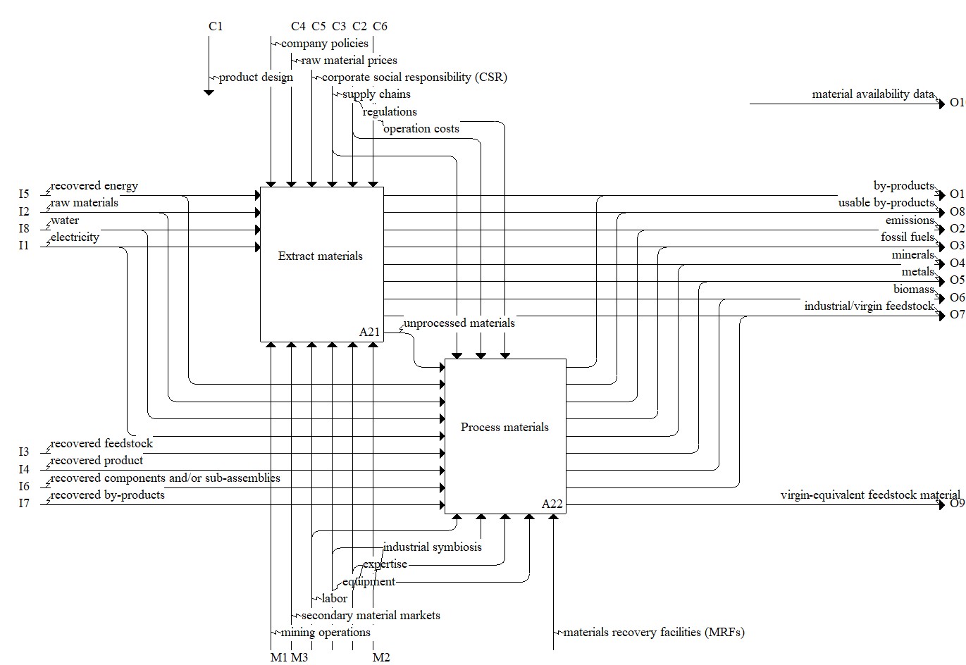 The material acquisition stage model consists of activities that are relevant to acquiring the material needed for production. A key difference for the material acquisition stage within a circular economy model is the existence of a supply stream of materials, products, and energy, along with associated information, that recirculates into the value chain from downstream life cycle stages (e.g., end-of-life). Click the individual Concepts for descriptions and examples of inputs, outputs, controls, and mechanisms relevant to a circular economy.Parent Activity: Acquire Materials