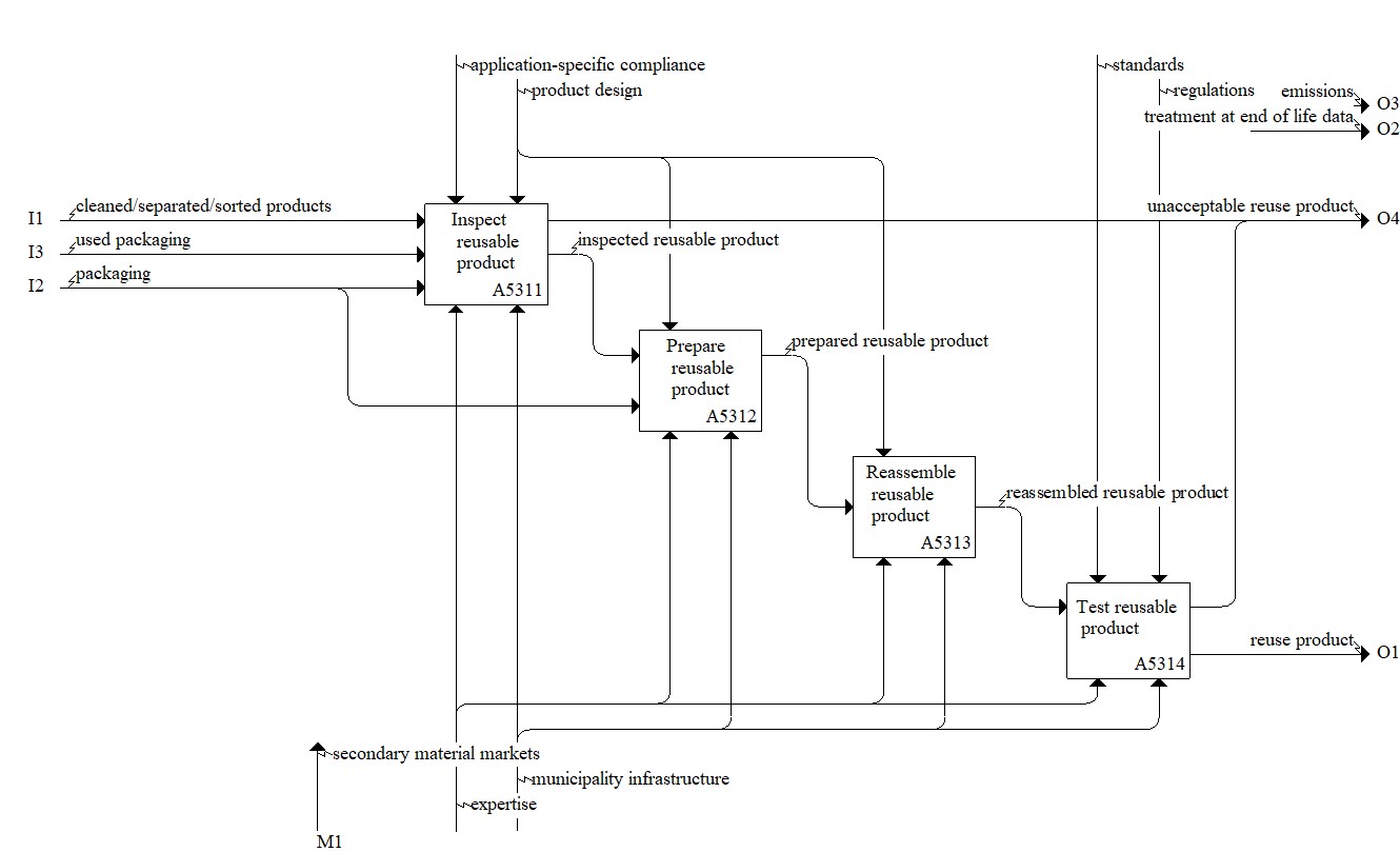 The reuse model consists of the activities necessary to enable a product to be used again, including inspection and testing. Click the individual Concepts for descriptions and examples of inputs, outputs, controls, and mechanisms relevant to a circular economy.Parent Activity: Reuse