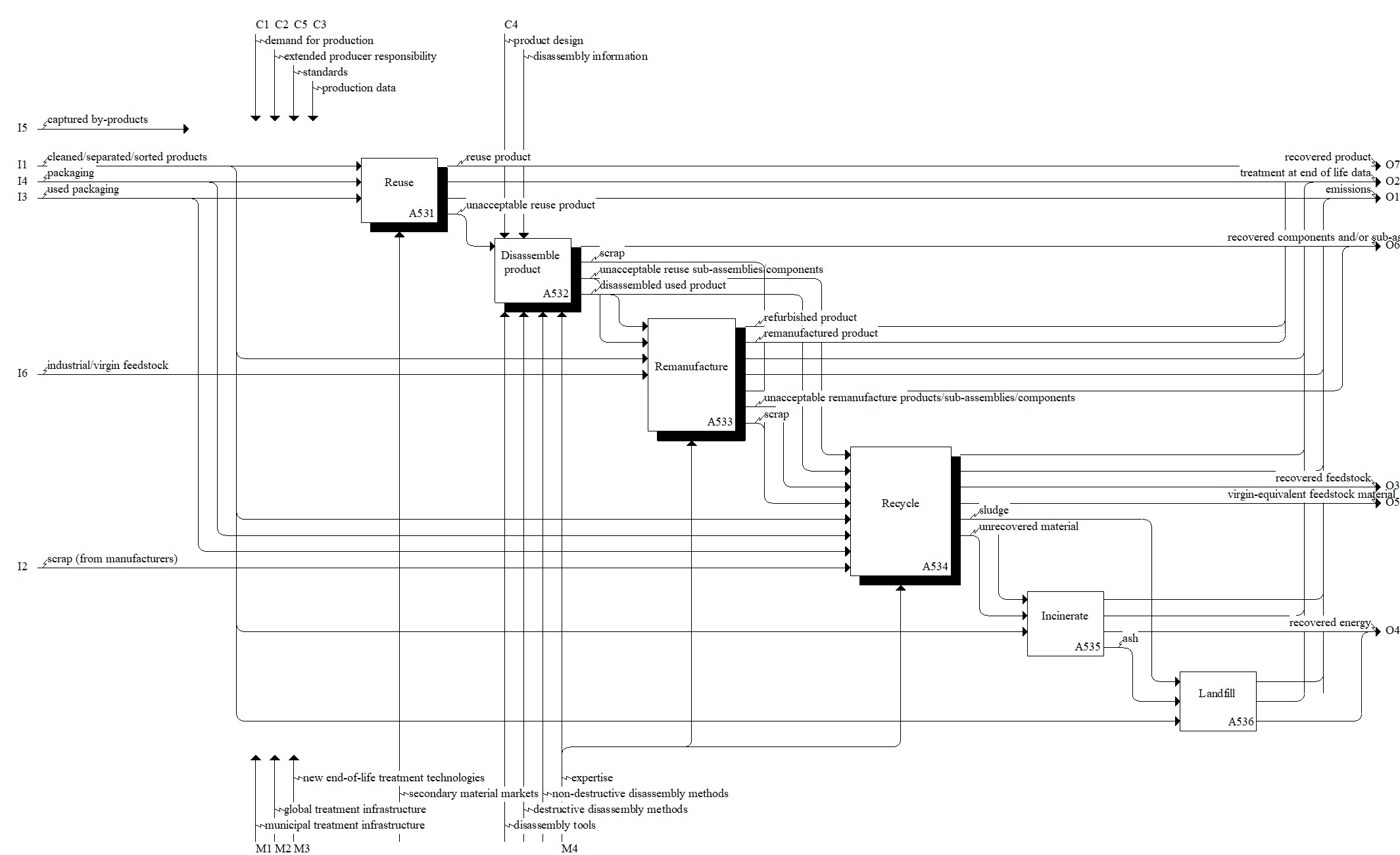 The treat end-of-life products model consists of activities that are necessary to process the products so they can be treated according to the waste hierarchy, including reuse or disassembly for remanufacturing and recycling.Parent Activity: Treat end-of-life products