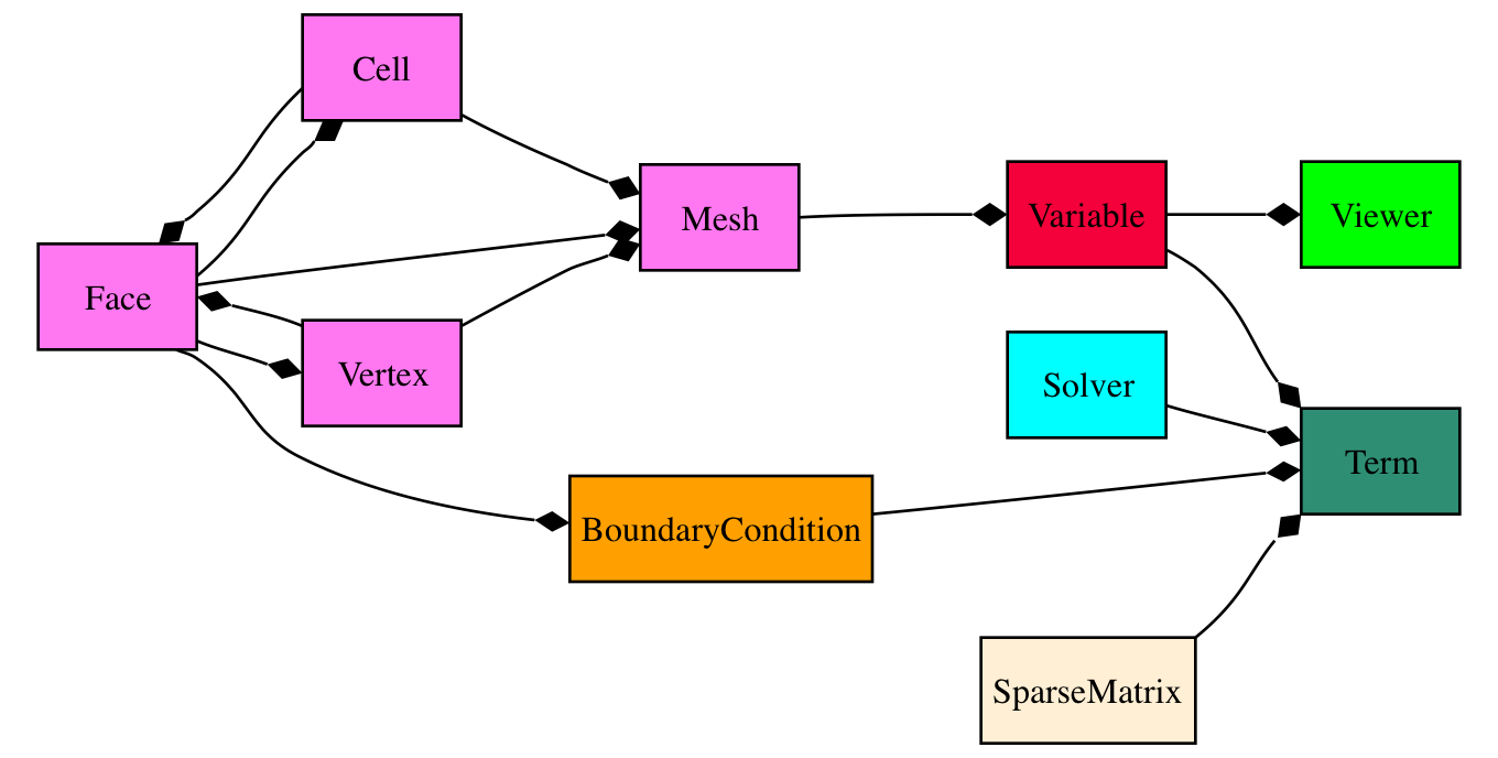A Mesh object is composed of cells. Each cell is defined by its bounding faces and each face is defined by its bounding vertices. A Term object encapsulates the contributions to the _SparseMatrix that defines the solution of an equation. BoundaryCondition objects are used to describe the conditions on the boundaries of the Mesh, and each Term interprets the BoundaryCondition objects as necessary to modify the _SparseMatrix. An equation constructed from Term objects can apply a unique Solver to invert its _SparseMatrix in the most expedient and stable fashion. At any point during the solution, a Viewer can be invoked to display the values of the solved Variable objects.