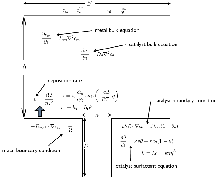 The following image shows a schematic of a trench geometry along with the governing equations for modeling electrodeposition with the CEAC mechanism. All of the given equations are implemented in the examples.levelSet.electroChem.simpleTrenchSystem.runSimpleTrenchSystem() function. As stated above, all the parameters in the equations can be changed with function arguments.