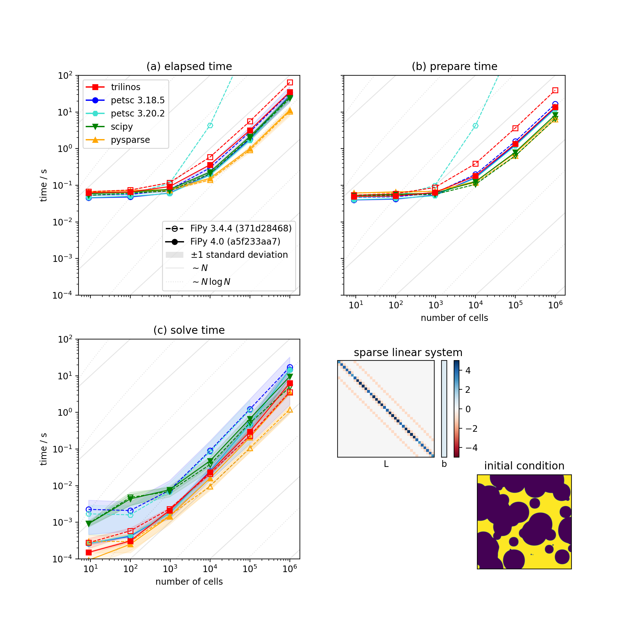 Comparison of serial performance for different solver suites, solvers and preconditioners, and different versions of FiPy [4]. (a) Total elapsed time, (b) time to prepare the matrix, and (c) time to solve the matrix as functions of mesh size. [5]