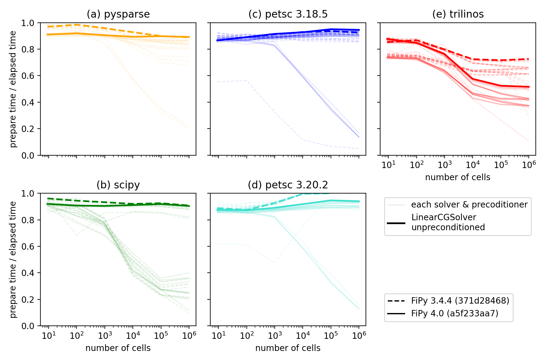 Ratio of time to prepare the matrix to the combined time to prepare and solve the matrix for different solver suites, solvers and preconditioners, and different versions of FiPy [4] [5]. The thick lines highlight LinearCGSolver with no preconditioner, one of the better-performing combinations available in all suites.