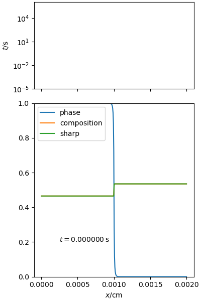 This evolution is qualitatively consistent with that seen in examples.phase.binary, but the interface does not move as far and the bulk concentrations are further from the phase diagram values. The computation also takes substantially longer than the uncoupled variant.