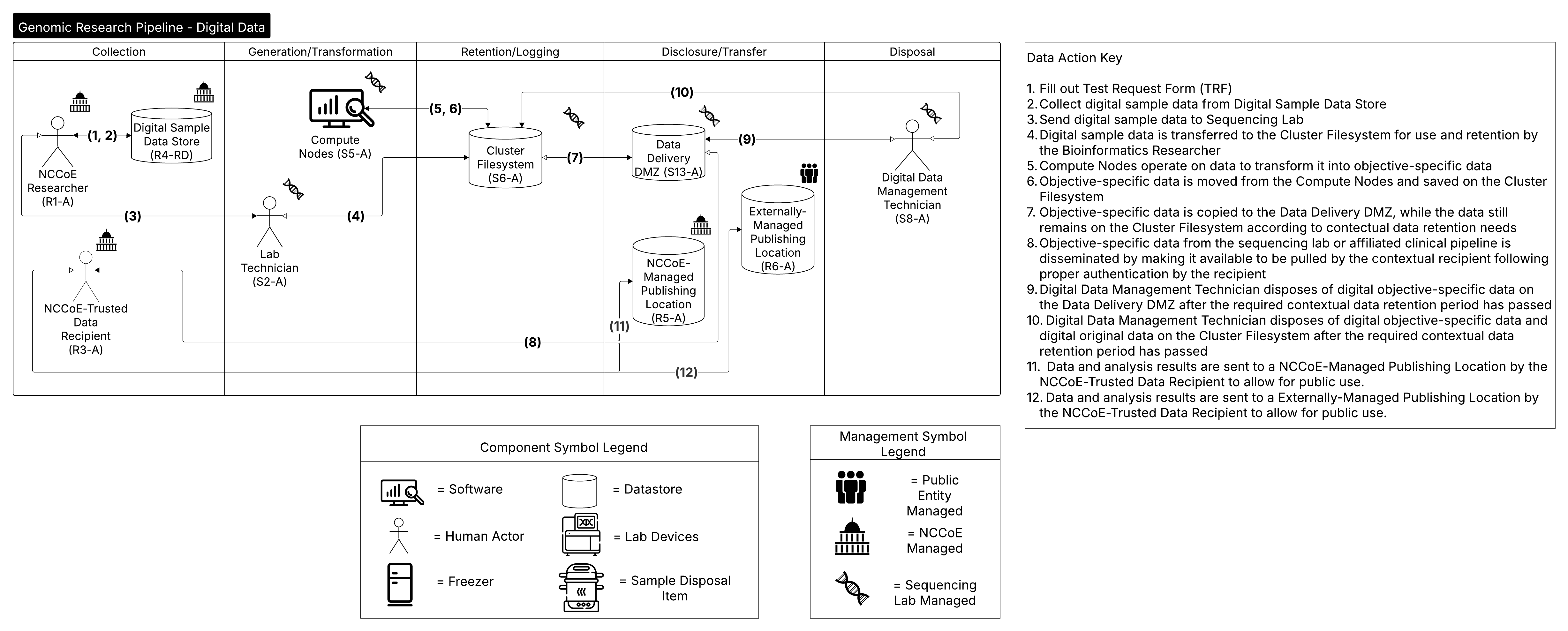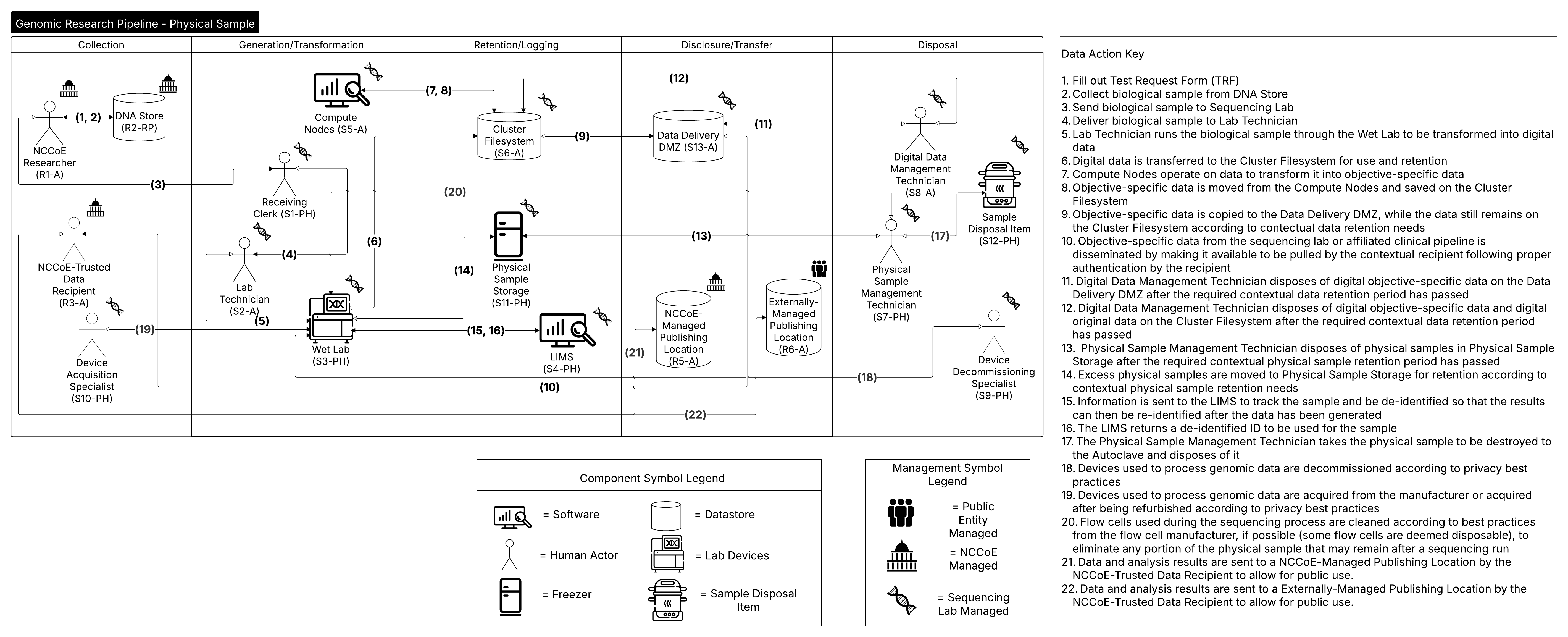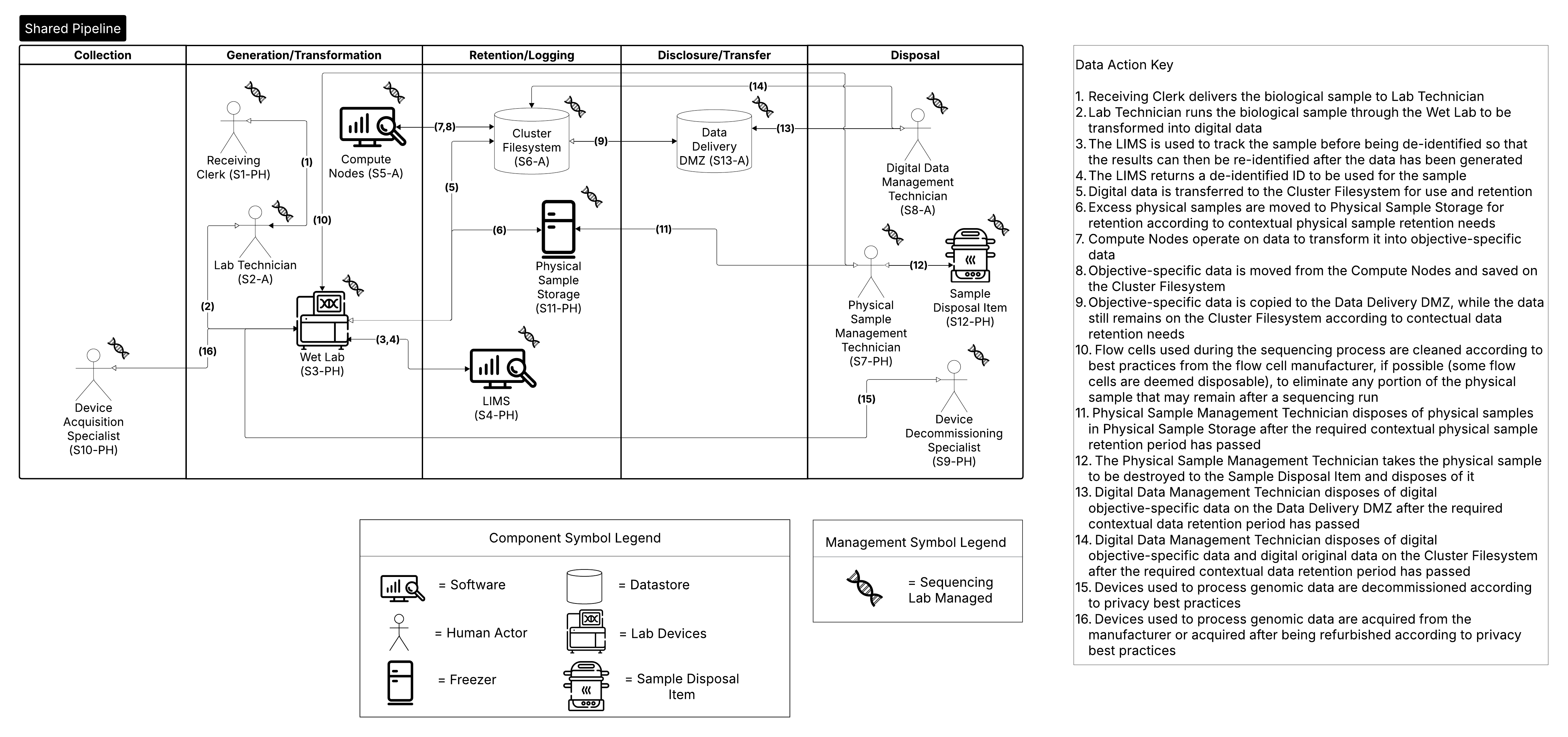 Each two-dimensional object with solid lines represents a component. All lines connecting components represent dataflows that can be either digital or physical (such as a network connection or a human inserting a physical sample into a sequencer). Dataflows are shown as double-headed arrows. A hollow arrow on one side of a given dataflow implies that the component on that side of the dataflow is the exclusive source.
