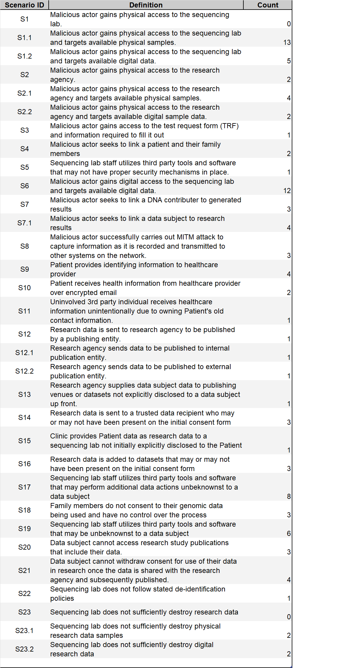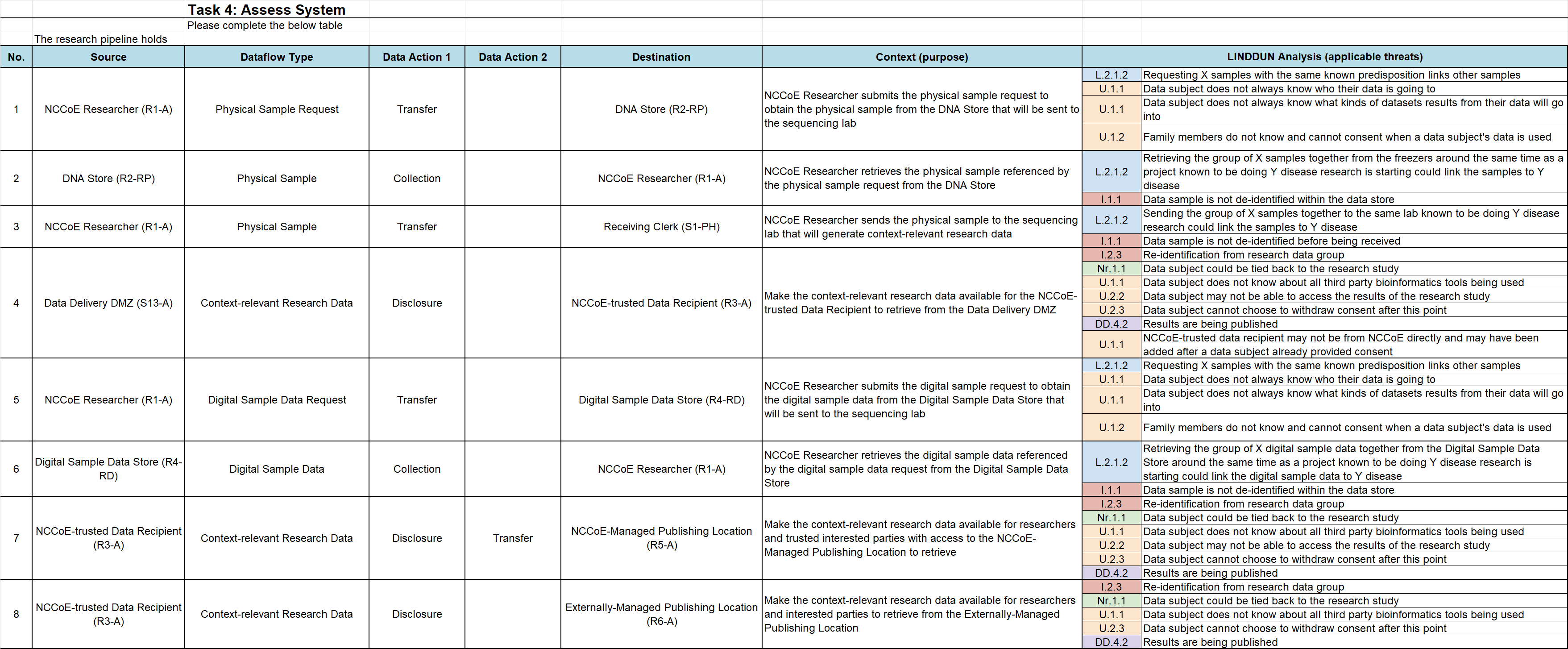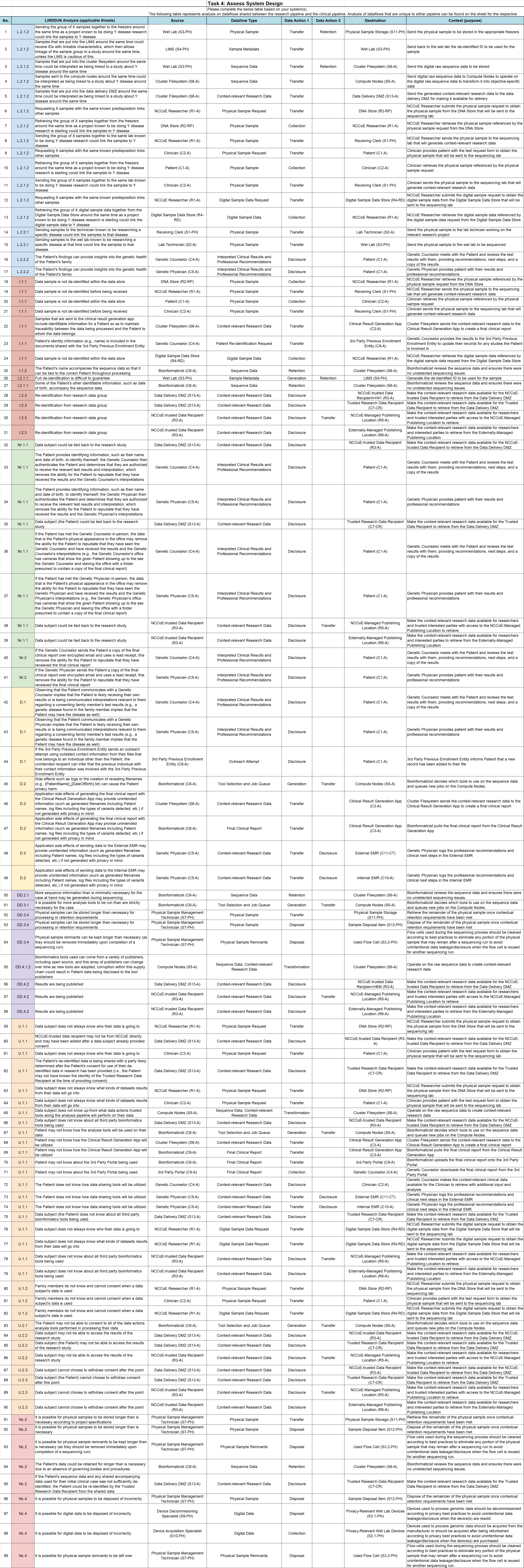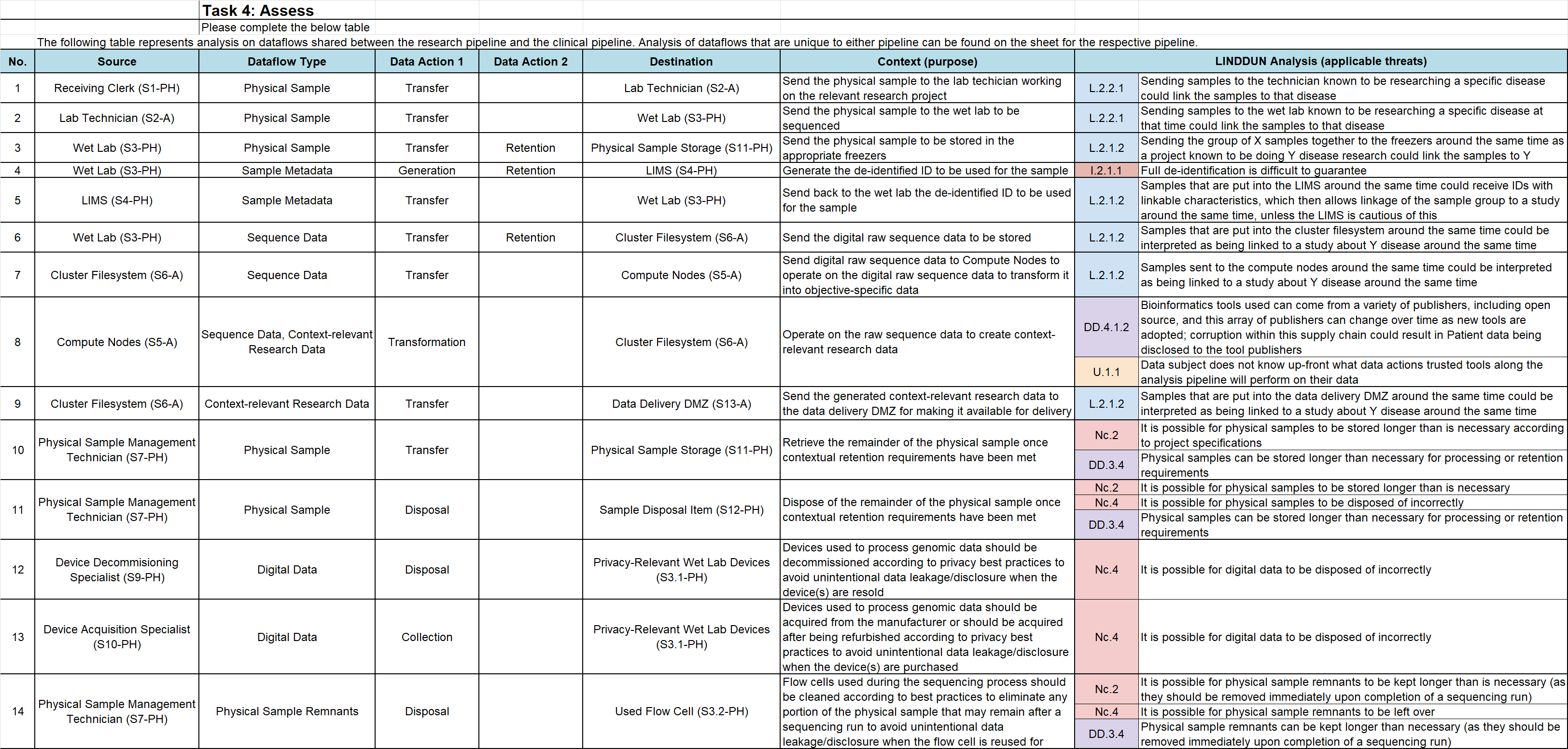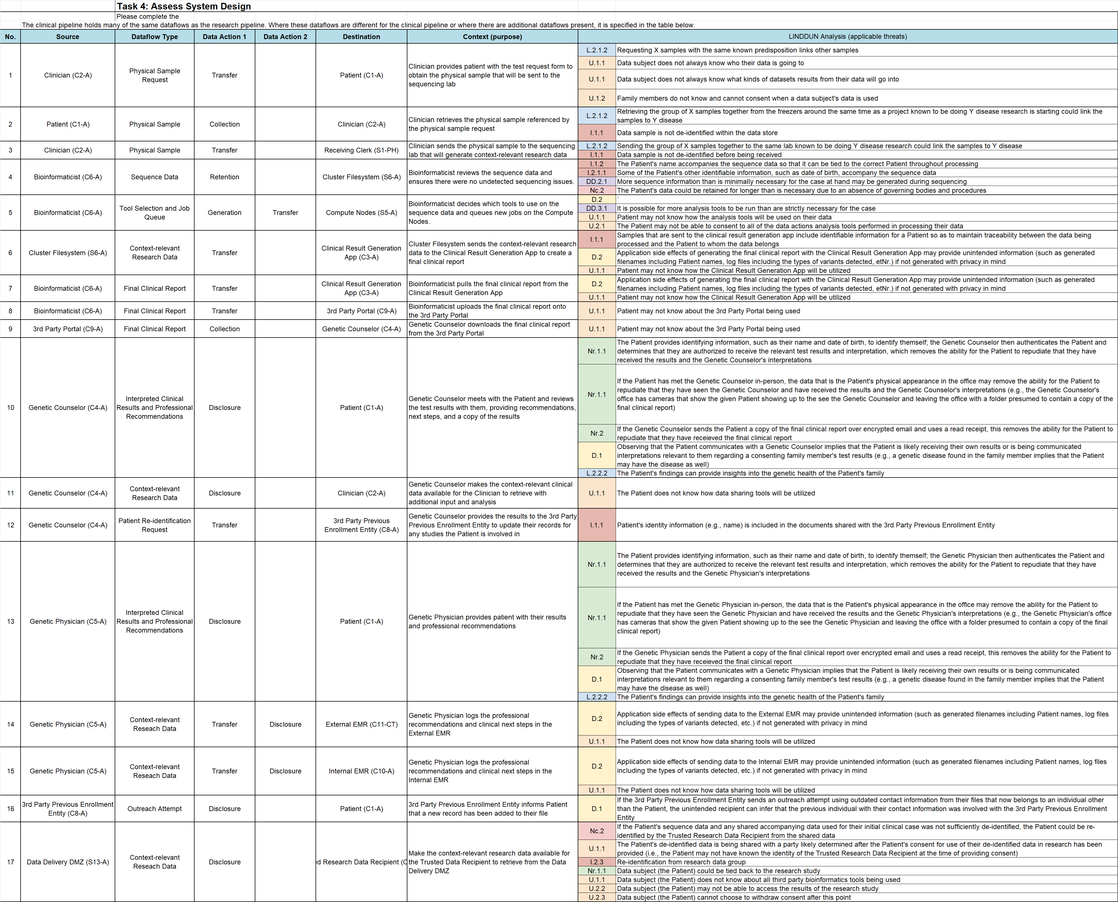 This appendix presents the LINDDUN and PANOPTIC analyses for the complete example. The LINDDUN dataflow analysis was initially broken down in a manner similar, but not identical, to the dataflow diagrams, with separate analysis tables for the clinical and research use cases together with a table for their shared dataflows. The individual tables were integrated into a single table that was then sorted on the LINDDUN threat families. Separate PANOPTIC threat action mappings were generated for the clinical and research use cases and used to identify attack scenarios.