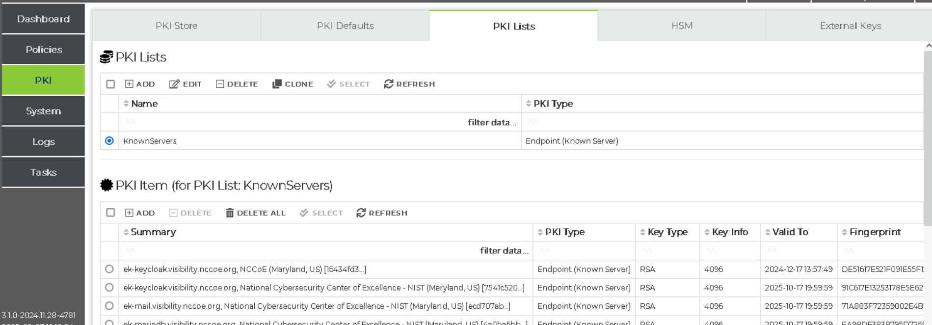 PKI > PKI Lists.Create a new list and upload each server’s TLS PKI certificate and key to the inventory. All of the server certificates for this lab were added to a certificate list namedKnownServers. Traffic using a certificate not in this inventory will not be decrypted.