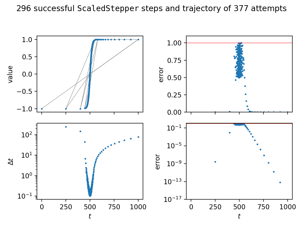 >>> old = -1. >>> stepper = ScaledStepper(start=0., stop=totaltime, inclusive=True, ... record=True) >>> for step in stepper: ... new = np.tanh((step.end / totaltime - 0.5) / (2 * width)) ... ... error = abs(new - old) / errorscale ... ... if step.succeeded(value=new, error=error): ... old = new