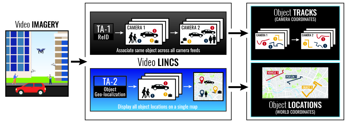 The goal of the Video LINCS program, is to research and develop novel capabilities to autonomously re-identify objects across diverse video sensor collections and map all objects to a common reference frame. Re-identification (reID) is the process of matching the same object across a video collection, to determine where the object appears throughout the video. Video LINCS will research approaches that will facilitate autonomous reID in an open-world setting where there is no advance knowledge of the sensors, scene, content, or video collection geometries. ReID technologies will initially be developed for specific object classes that are known in advance, such as people and vehicles, and ultimately extend to all objects in the video footage without advance knowledge of specific object types. The capability to autonomously remap object locations from individual camera reference frames to a single common reference frame, nominally a geo-reference frame (geo-localization), will also be developed.